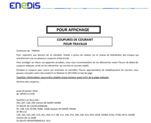 Une coupure de courant est prévu le 29 janvier 2026 à 10h30 à 11h30 dans les quartiers suivants :